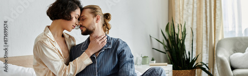 Fototapeta premium A loving couple cuddles on a bed at home, enjoying a relaxing moment together.