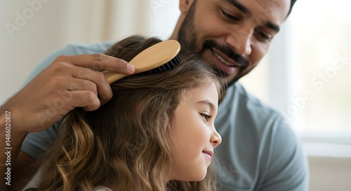 Fototapeta premium A loving father gently brushes his daughter's hair, creating a tender family...