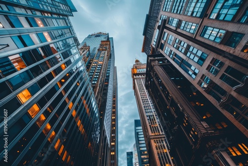 © Iftikhar alam, Obraz premium A low angle shot of tall skyscrapers with a cloudy sky in the background, Depict the contrast between modern skyscrapers and historic buildings in the city
