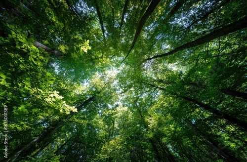 Naklejka premium A low-angle shot reveals a dense canopy of lush green trees, sunlight...