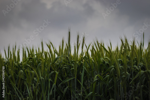Fototapeta premium A low-angle view of a field of green wheat, against a backdrop of a cloudy...