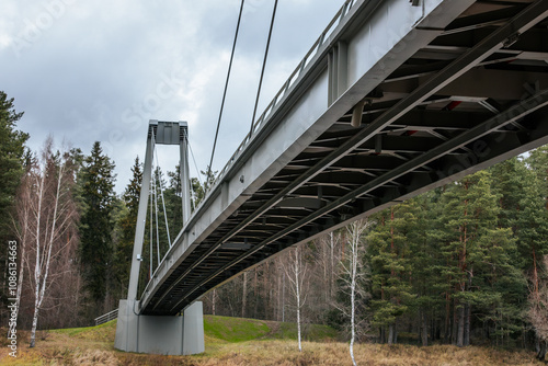 © Emvats, Fototapeta premium A low-angle view of a modern suspension bridge, showcasing the structural beams and cables. The bridge spans a natural landscape with tall evergreen trees and a cloudy sky in the background.