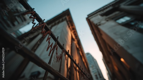 © DKPhoto, Obraz premium A low-angle view of a rusty wrought iron fence juxtaposed against a backdrop of urban architecture, capturing the gritty beauty of city living during dusk. This image reflects themes of resilience an