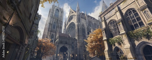 © Pornarun, Naklejka premium A low angle view of a tall, intricately designed building in an urban setting.