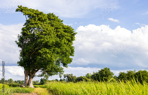 © kaentian, Fototapeta premium A low angle view of a towering tree providing shade on an embankment.