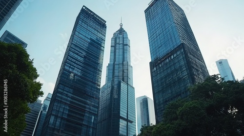 Fototapeta premium A low angle view of modern skyscrapers in a city with a clear blue sky.