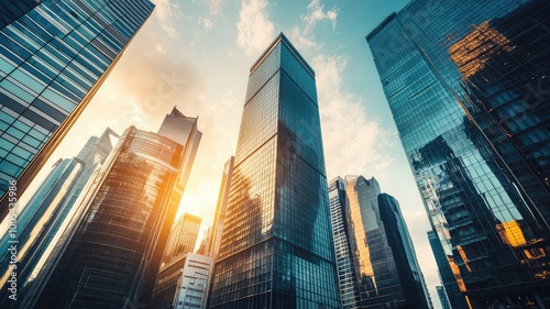 Fototapeta premium A low angle view of towering skyscrapers in a city, with the sun shining...