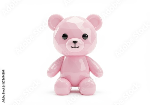 © Tanakorn, Fototapeta premium A low-poly pink bear with black eyes and mouth is sitting against a bright white backdrop