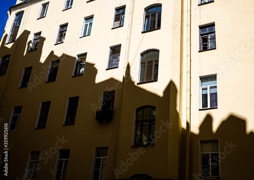 © Aleksandr, Fototapeta premium a low-rise residential building with European-style Windows, which is clearly shadowed by another building