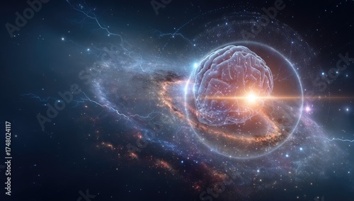 © Kuning, Obraz premium A luminous brain encased in a shimmering force field against a cosmic nebula backdrop