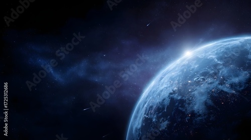 © Bussakon, Obraz premium A luminous Earth globe emerges from darkness illuminated by a bright sunrise and glowing city lights set against a backdrop of stars and nebulae