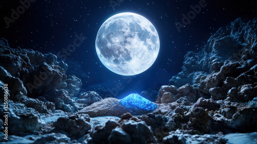 Fototapeta premium A luminous full moon illuminates a rocky landscape, highlighting a sparkling blue mound, creating a serene and mystical nighttime scene.