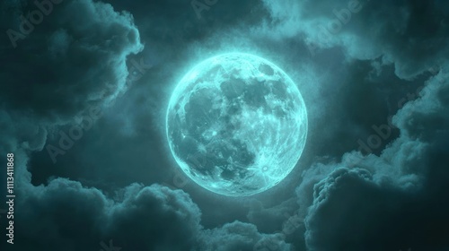 © logyartstudios, Obraz premium A luminous full moon surrounded by dark, swirling clouds in a night sky.