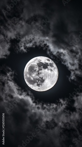 Naklejka premium A luminous full moon surrounded by wispy clouds in a dark sky, creating an enchanting night scene.