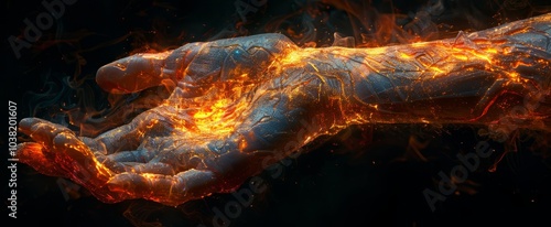 Fototapeta premium A luminous hand glimmers with fiery orange and yellow hues, surrounded by...