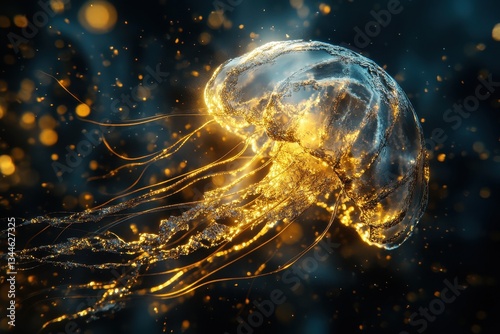 Fototapeta premium A luminous jellyfish floats delicately through a dark underwater space