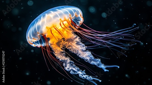 Fototapeta premium A luminous jellyfish gracefully floats in dark water