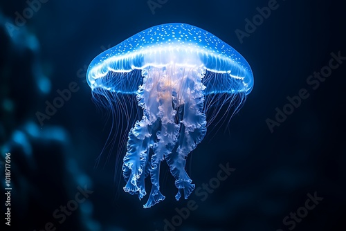 © Liza, Fototapeta premium A luminous jellyfish with white spots gracefully swimming in dark blue water