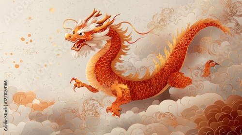 © Maleyka, Obraz premium A Lunar New Year design featuring a golden dragon, with abstract red and gold patterns, minimalistic elements