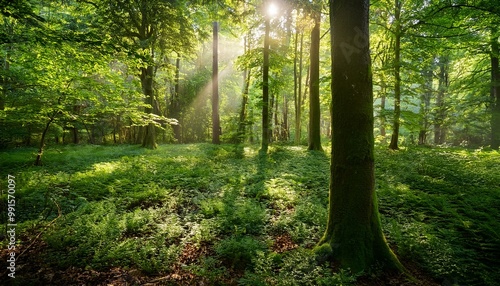Obraz premium A lush and lively woodland where beams of sunlight filter through the dense...