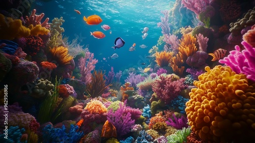 Naklejka premium A Lush Coral Reef Teeming with Exotic Fish and Sea Creatures