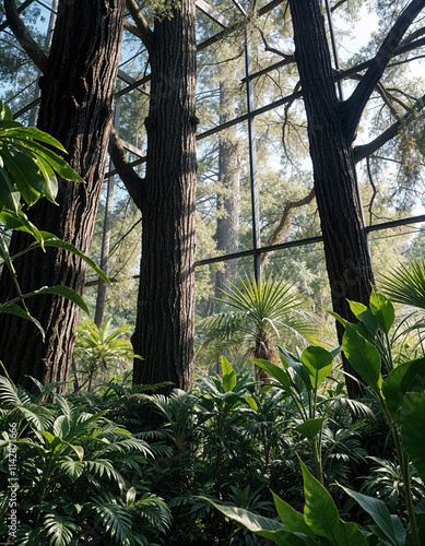 Naklejka premium A lush, dense forest with tall, towering trees and a variety of tropical plants and foliage in the foreground