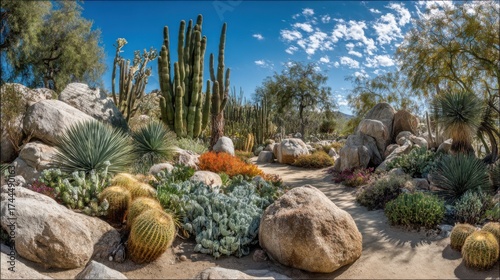 Fototapeta premium A lush desert garden showcases various cacti colorful blooms and large rocks under a bright blue sky. The scene captures the beauty of desert flora and serene pathways.