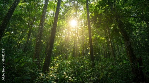 Naklejka premium A lush forest ecosystem thrives under sunlight filtering through tall trees, showcasing a healthy environment teeming with wildlife and greenery