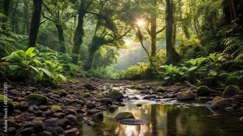 Obraz premium A lush forest in Fiji, with a serene river flowing through it. Generative AI