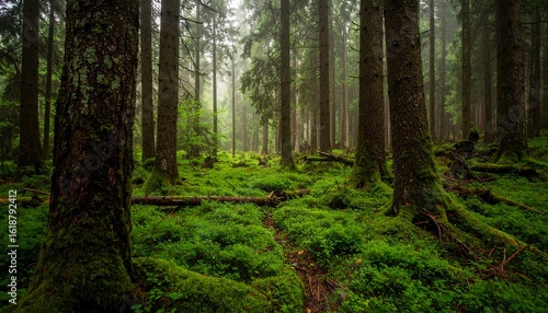 © stetephe, Obraz premium A lush forest scene showcasing tall trees, green moss, and a misty atmosphere.