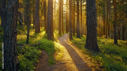 Fototapeta premium A lush forest trail winds through ancient trees, with sunlight symbolizing a...
