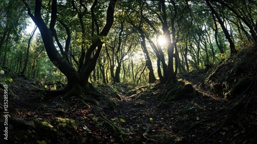 Obraz premium A lush forest with a trail leading through it. Sunlight filters through the...