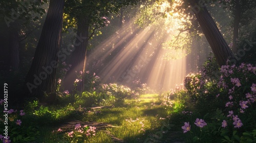 Obraz premium A lush forest with sun rays breaking through tall trees, casting a warm glow...