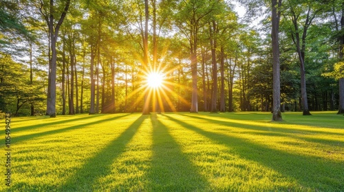 Obraz premium A lush forest with sunlight peeking through the branches, leaving an inviting open space for text in the foreground.