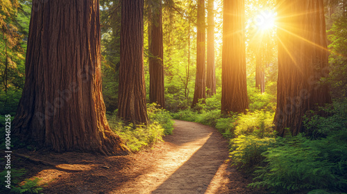 © GoldPumaze, Obraz premium A lush forest with towering redwood trees and a sunlit path.