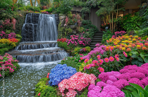 Obraz premium A lush garden with colorful flowers and a beautiful waterfall cascading down...