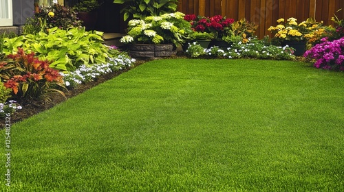 © Sawat, Fototapeta premium A lush green backyard with neatly trimmed grass, ornamental plants, and potted flowers.