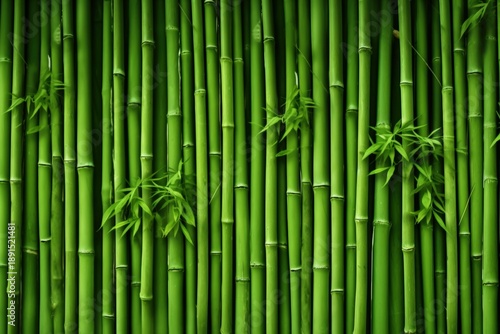 Fototapeta premium A lush, green bamboo forest backdrop featuring tall, slender bamboo stalks with delicate leaves, creating a serene and natural atmosphere.