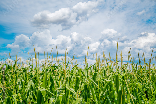 Fototapeta premium A lush green cornfield stretches under a bright blue sky with fluffy white...