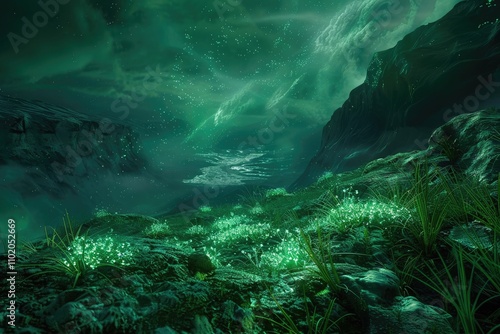 © boler, Obraz premium A Lush, Green, Ethereal Landscape Under a Starry Night Sky
