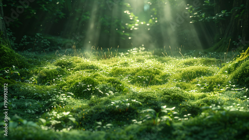 © Aleksandr Matveev, Obraz premium A lush green field with a bright sun shining down on it. The sun's rays create a warm and inviting atmosphere