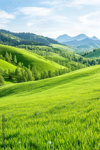 © azurita, Fototapeta premium A lush green field with mountains in the background