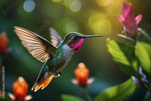 Obraz premium a lush green forest, exotic flowers and an origami hummingbird next to the...