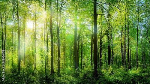 Naklejka premium A lush green forest featuring towering trees with sunlight filtering through the foliage creates a picturesque natural backdrop, evoking the essence of spring or summer