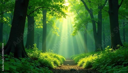 © Chatthorn, Fototapeta premium A lush green forest scene, sunlight dappling through the canopy , foliage, fresh