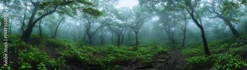 © pingpao, Fototapeta premium A lush, green forest shrouded in mist, with dense foliage and tall trees creating a tranquil, natural atmosphere.