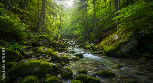 Obraz premium A Lush green forest stream flowing peacefully through moss covered rocks
