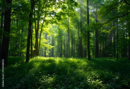 Obraz premium A lush green forest where sunlight gently streams through the trees, creating...