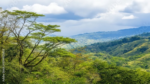 Fototapeta premium A lush green forest with a cloudy sky in the background