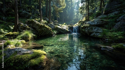 Naklejka premium A lush green forest with a flowing stream and verdant foliage surrounding a waterfall cascading onto rocks